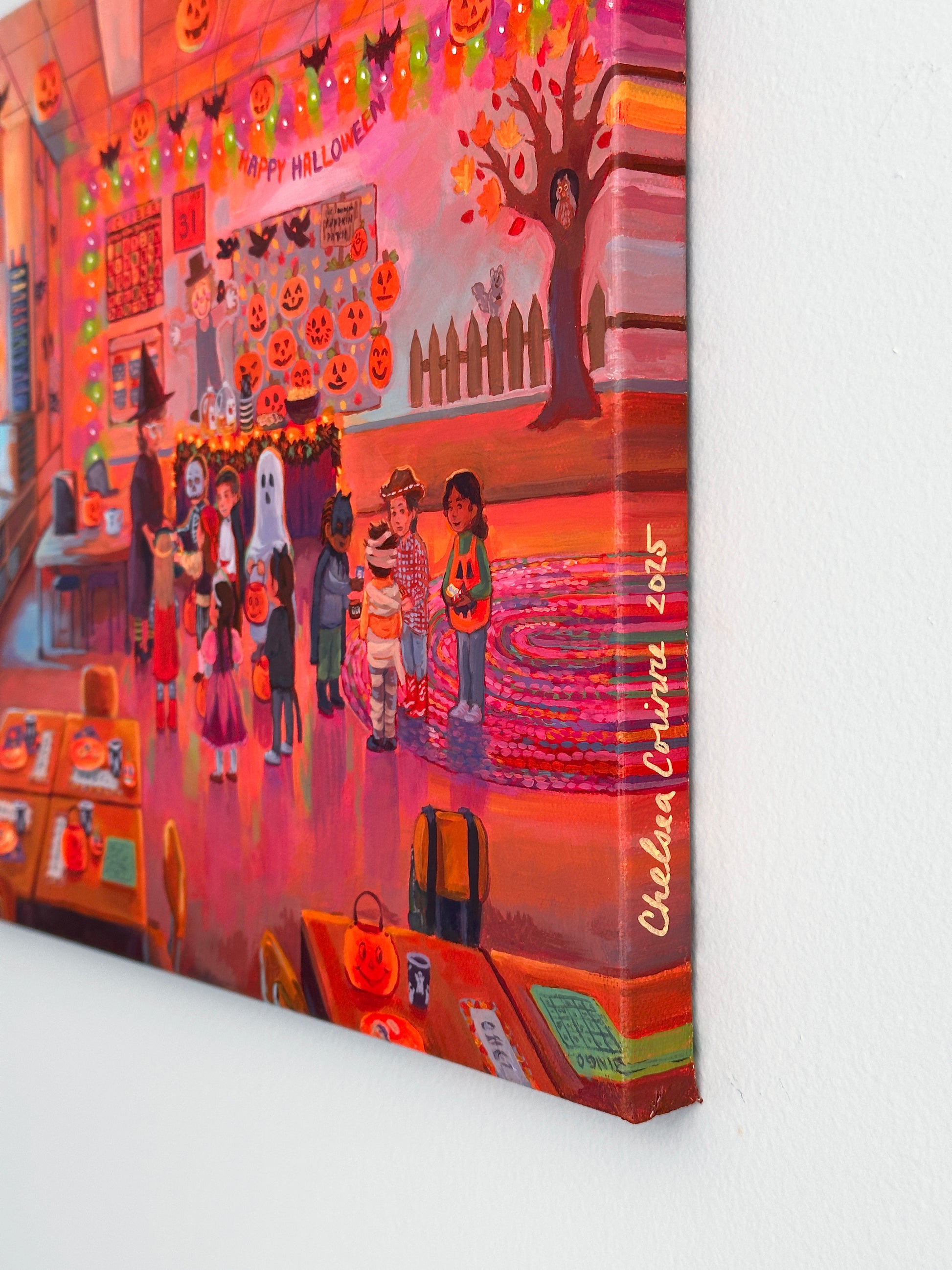 This one-of-a-kind 12x16 original acrylic painting is filled to the brim with the details of a shared childhood memory: the Halloween classroom party. From leaves taped to the windows, fall craft projects, Pillsbury cookies, candy trades, everyone in costumes -- I spent many thoughtful hours putting together this vibrant, sentimental snapshot of childhood. My hope is that this painting will not only envelop you in the soft, incandescence of a warm memory, but that it will also inspire you to bring some of that magic back into the present day.